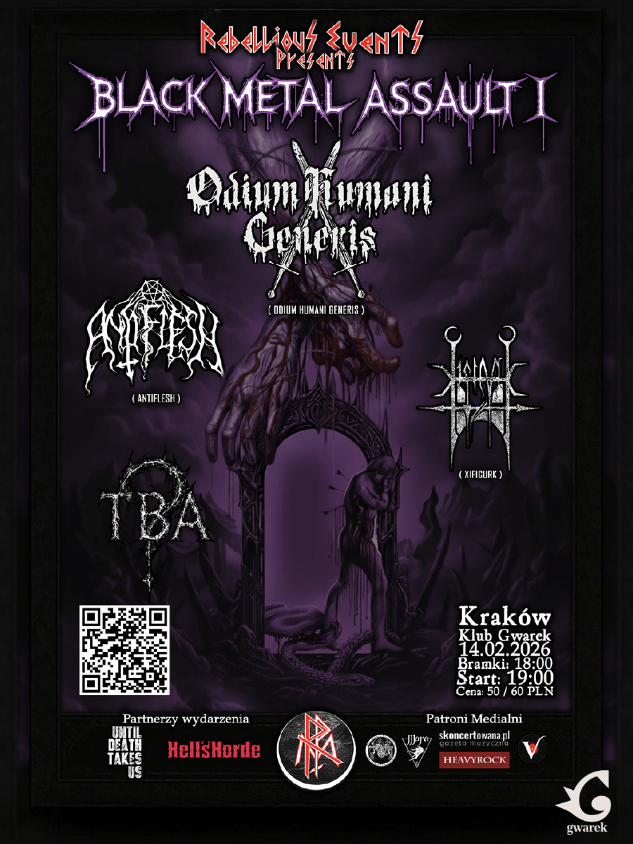 Bilety do kupienia na stronie: https://www.klubgwarek.pl/koncert/exAO3B/2026-02-14/Black-Metal-Assault-I-Odium-Humani-Generis-Antiflesh-XificurK