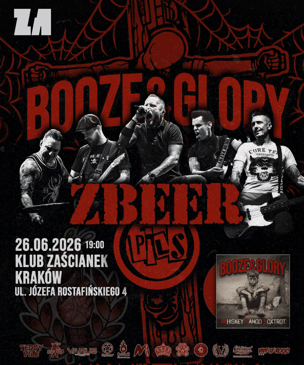 Po dwóch latach przerwy Booze & Glory powraca do Krakowa, aby zaprezentować materiał z najnowszego albumu „Whiskey Tango Foxtrot”. Podczas tego energetycznego wieczoru na scenie towarzyszyć im będzie legendarna formacja Zbeer.