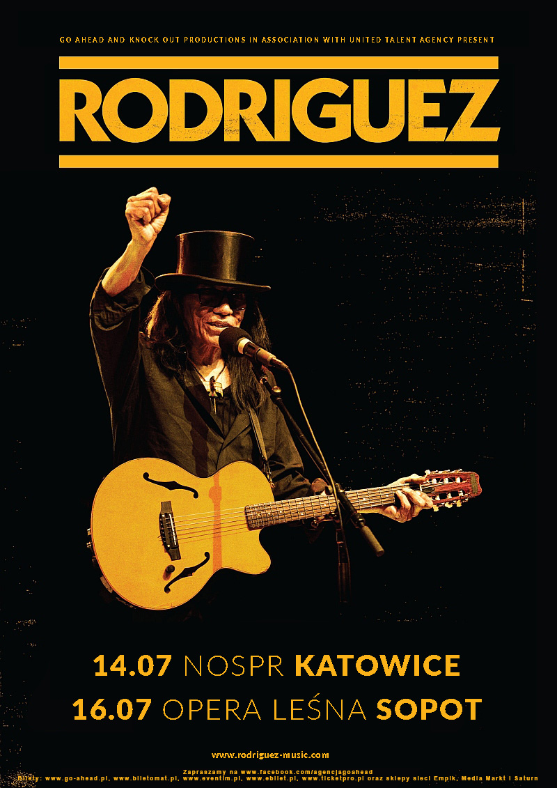 Agencje Go Ahead i Knock Out Productions z przyjemnoĹciÄ zapraszajÄ na dwa koncerty Rodrigueza! Muzyk, doskonale znany polskiej publicznoĹci zarĂłwno z filmu âSearching for Sugar Manâ, jak i z rewelacyjnych koncertĂłw, jakie daĹ w naszym kraju dwa lata temu, wystÄ pi w lipcu w Katowicach i Sopocie.
