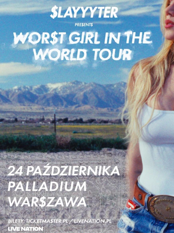 Poniedziałek, 16 marca 2026 r. – Slayyyter, artystka ciesząca się kultowym statusem i znana z przełamywania popowych schematów, ogłosiła trasę koncertową „WOR$T GIRL IN THE WORLD TOUR”. W jej ramach zaprezentuje na żywo materiał z wyczekiwanego albumu „WOR$T GIRL IN AMERICA”. Trasa obejmie koncerty w Ameryce Północnej i Południowej, Wielkiej Brytanii oraz Europie. Trasa rozpocznie się we wrześniu 2026 roku, po głośnym debiucie Slayyyter na festiwalu Coachella w kwietniu oraz występie na nowojorskim The Governors Ball w czerwcu.